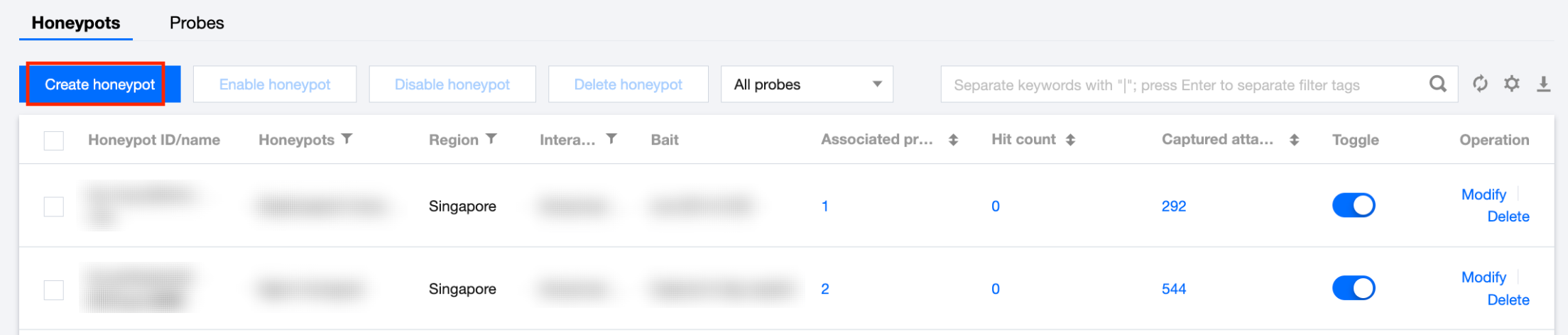 关闭蜜罐服务后,关联探针的流量将无法转发到对应蜜罐服务中。