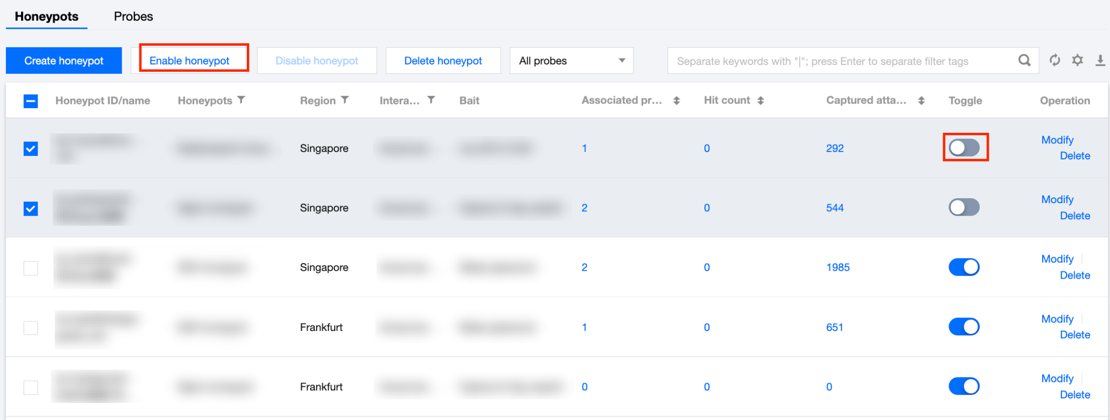 1.1 在网络蜜罐页面,支持单个或批量关闭蜜罐,具体操作如下。