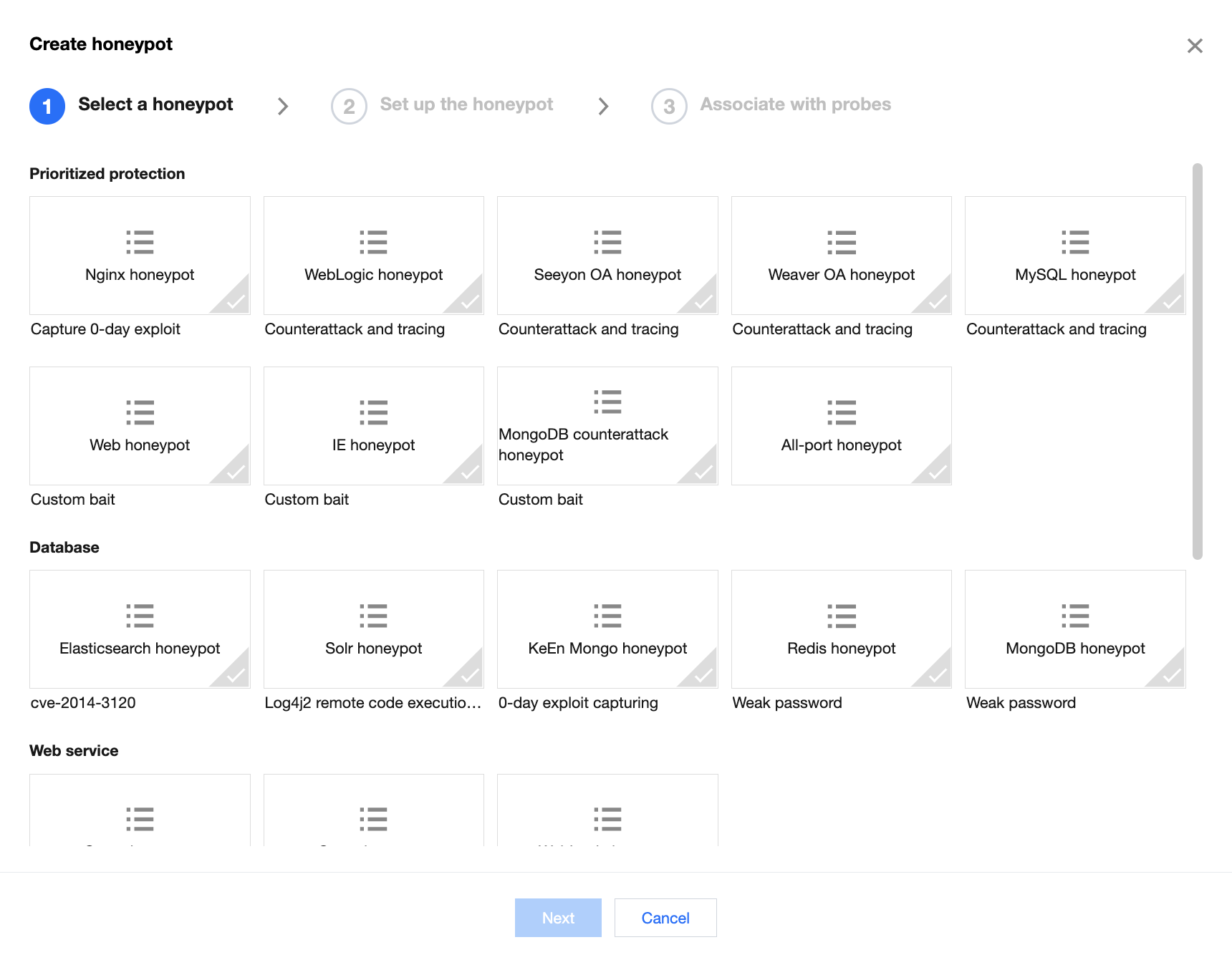 WEB 蜜罐:可选择现有的 SSH/MySQL 蜜罐作为自定义诱饵,如果您还没有 SSH/MySQL 蜜罐,请先创建并绑定探针。