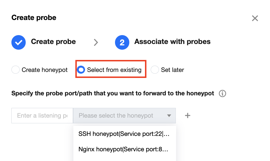 高级配置:支持从现有添加和新建两种方式关联转发蜜罐服务。
