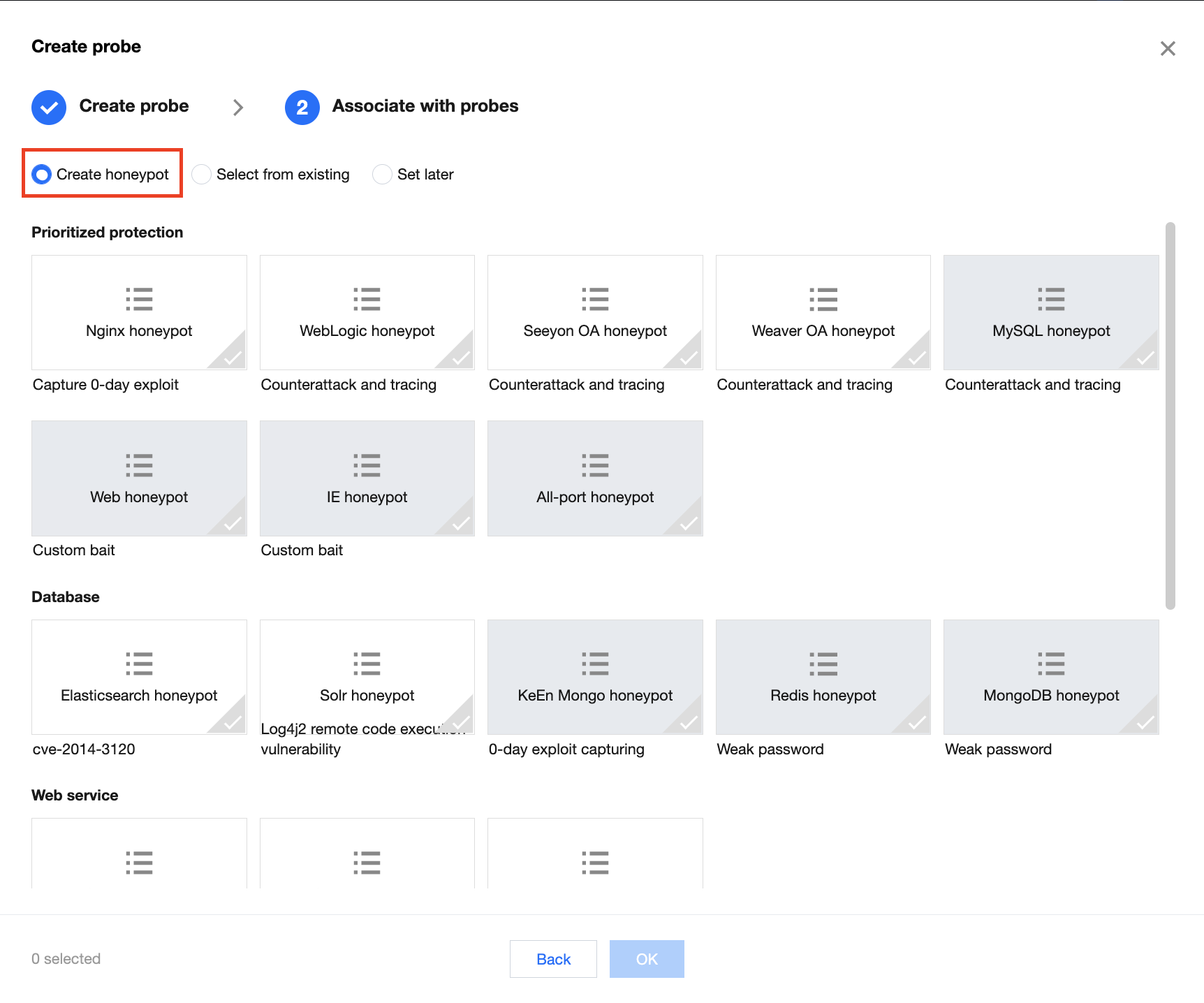 快速选择:单击快速选择,勾选所需蜜罐服务即可。
