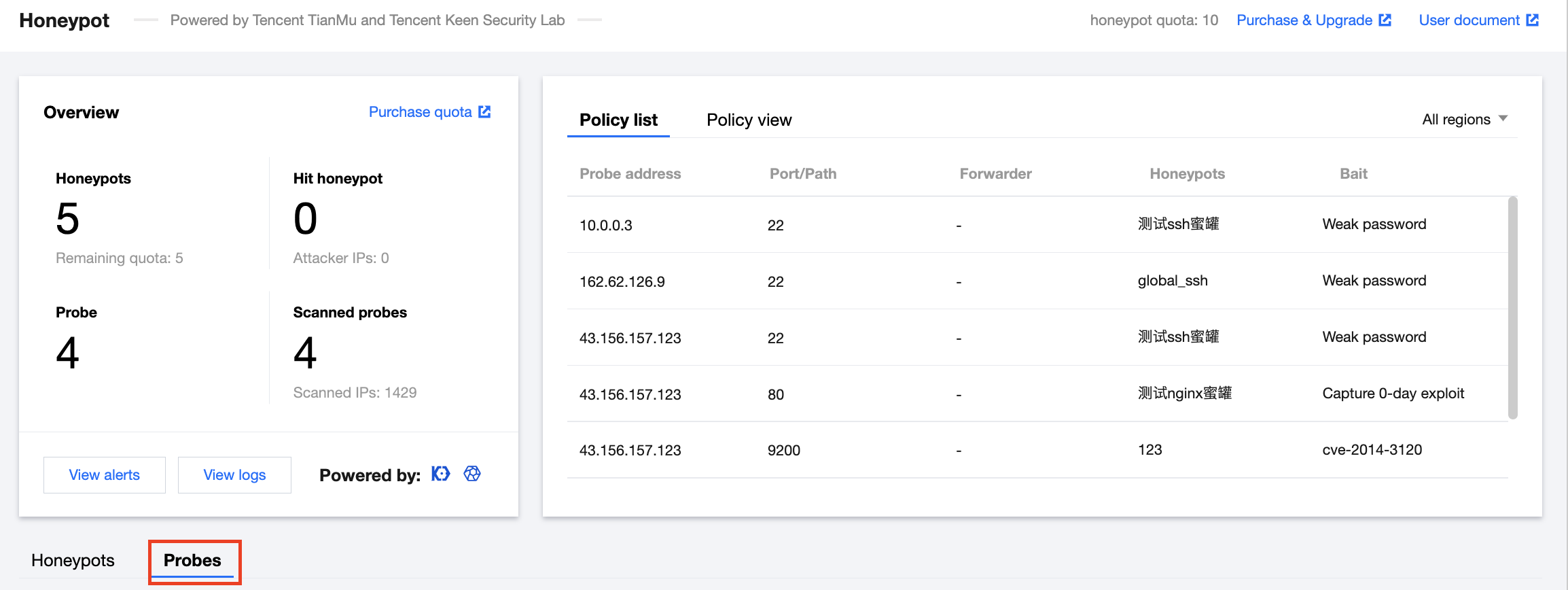 公网 IP:选择现有的一个公网 IP 部署探针,该 IP 上的指定端口的流量将会转发到蜜罐服务中。