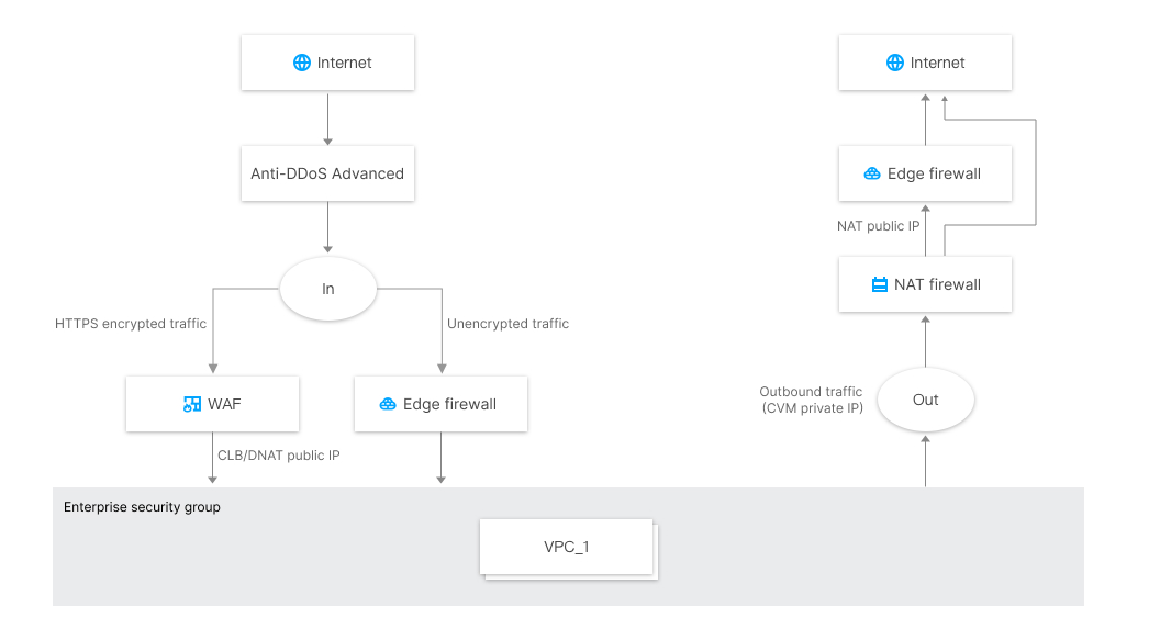 云防火墙和 WAF 共同组成了云上网络安全的整体边界防护,WAF 更偏向于对加密的 HTTPS 流量进行防护,非加密流量通过云防火墙集成的威胁情报、 入侵防御系统(IPS)的基础规则和虚拟补丁等进行安全防护。