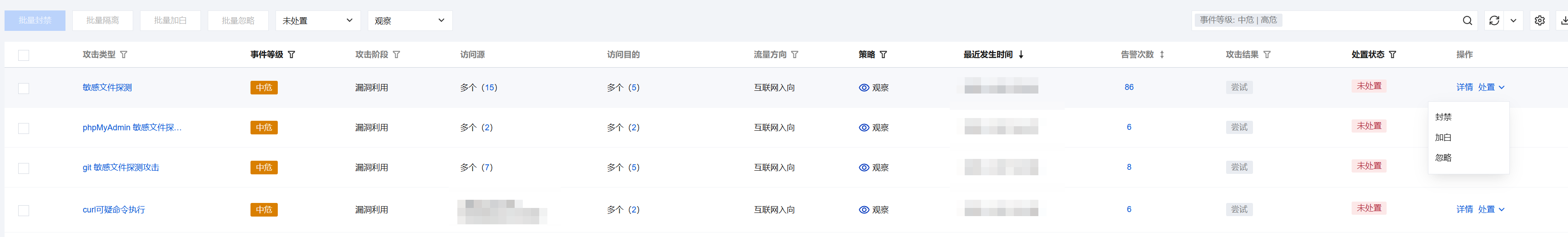 处置操作 | 封禁 | 将指定云外 IP 加入入侵防御-封禁列表中,拦截其所有访问请求。 |