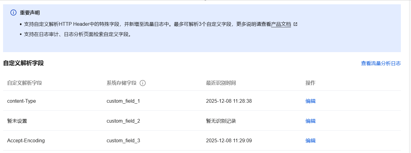 2. 在自定义解析字段列表中,选择需要编辑的字段并单击编辑,即可对 HTTP Header 中的特殊字段进行自定义解析,并将其新增至流量日志中。当前最多支持解析 3 个自定义字段。