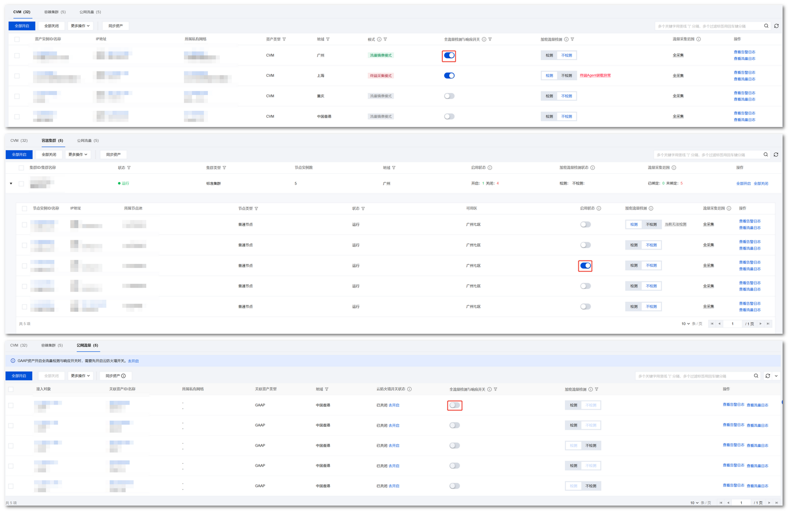 自动开启全流量检测与响应开关开启时,发现新的公网与非公网的 CVM、容器,以及公网流量资产后,会自动开启流量解析。