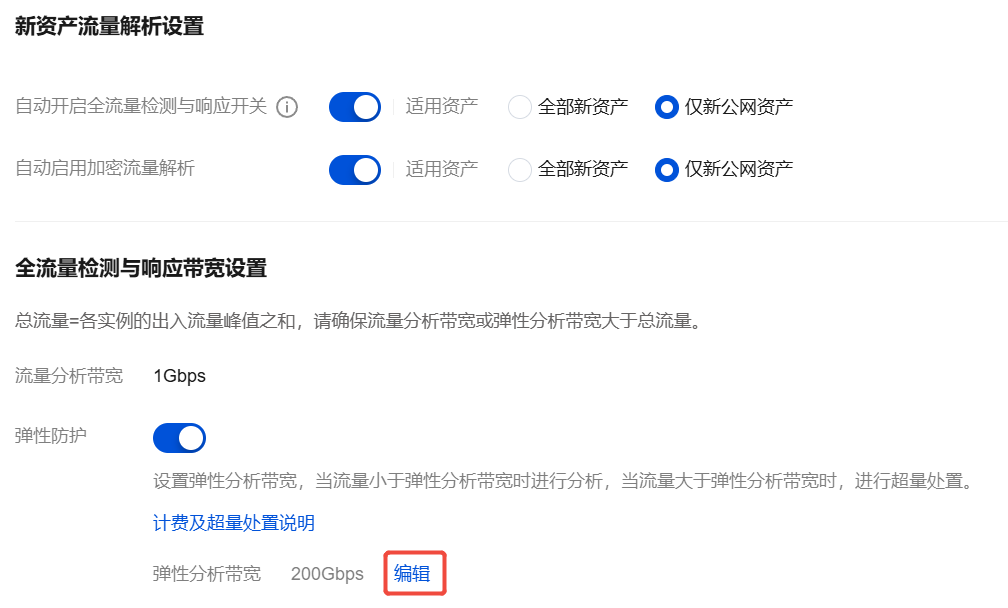 弹性防护:支持设置弹性分析带宽,当流量小于弹性分析带宽时进行分析,当流量大于弹性分析带宽时,进行超量处置。计费及超量处置说明请详见 带宽相关。您可以根据需要调整弹性分析带宽数值。单击编辑进行修改,完成后单击确认调整保存设置。 全流量检测与响应超量处置:流量分析带宽超量不会导致客户业务流量丢包或影响流量速率,但将无法提供全流量检测与响应功能。