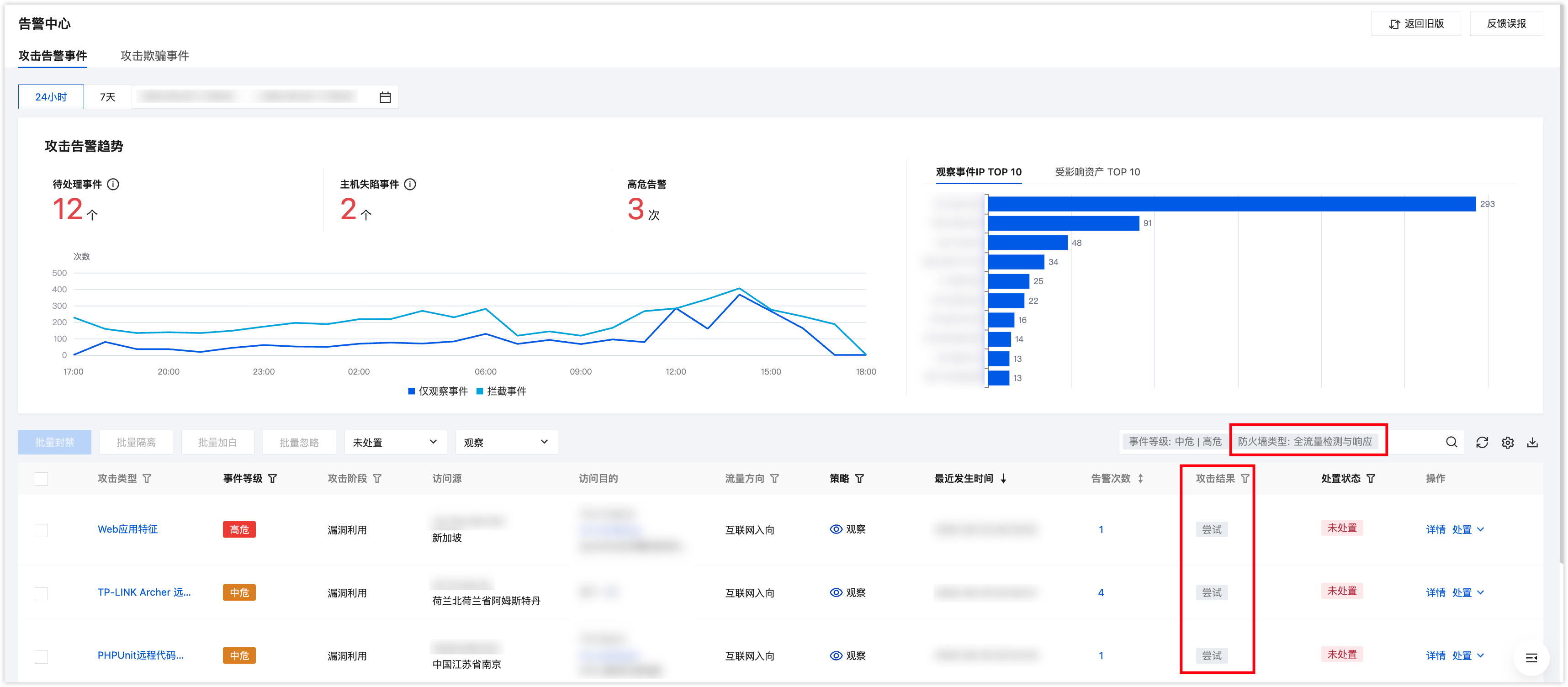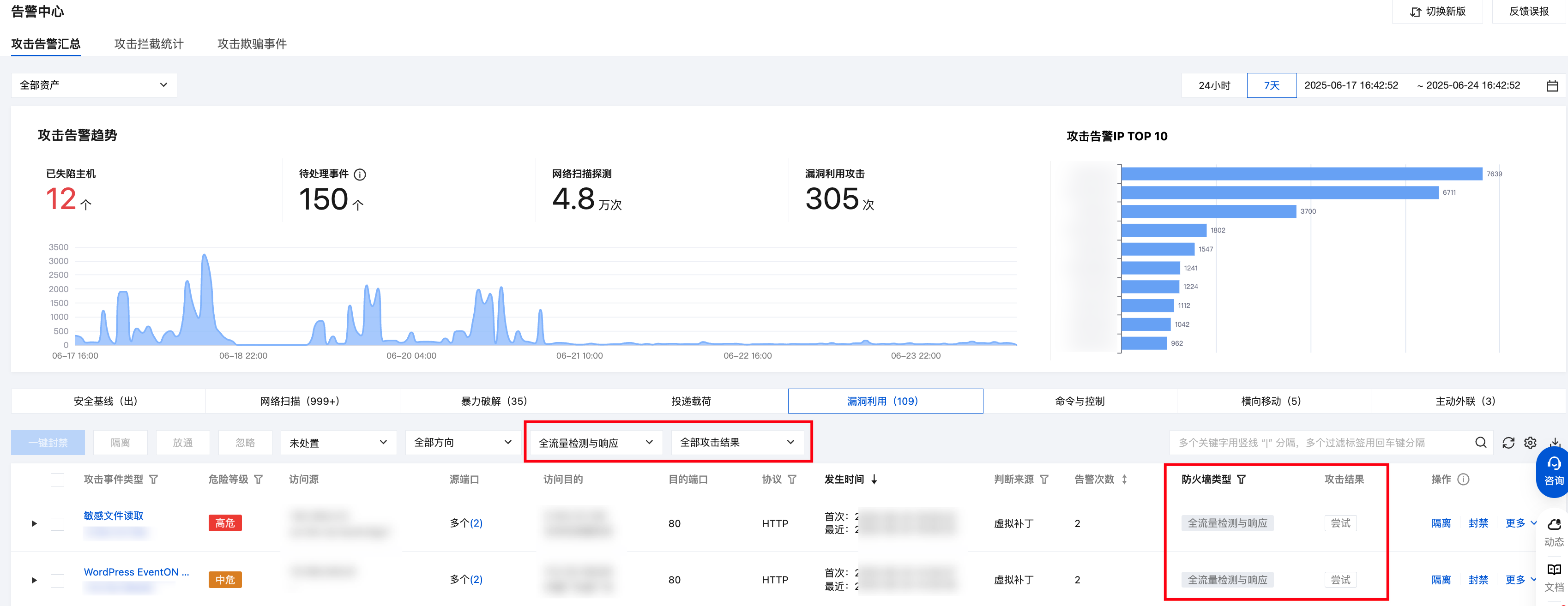 所有流量会经过入侵防御引擎,基于入侵防御规则进行检测分析并告警。