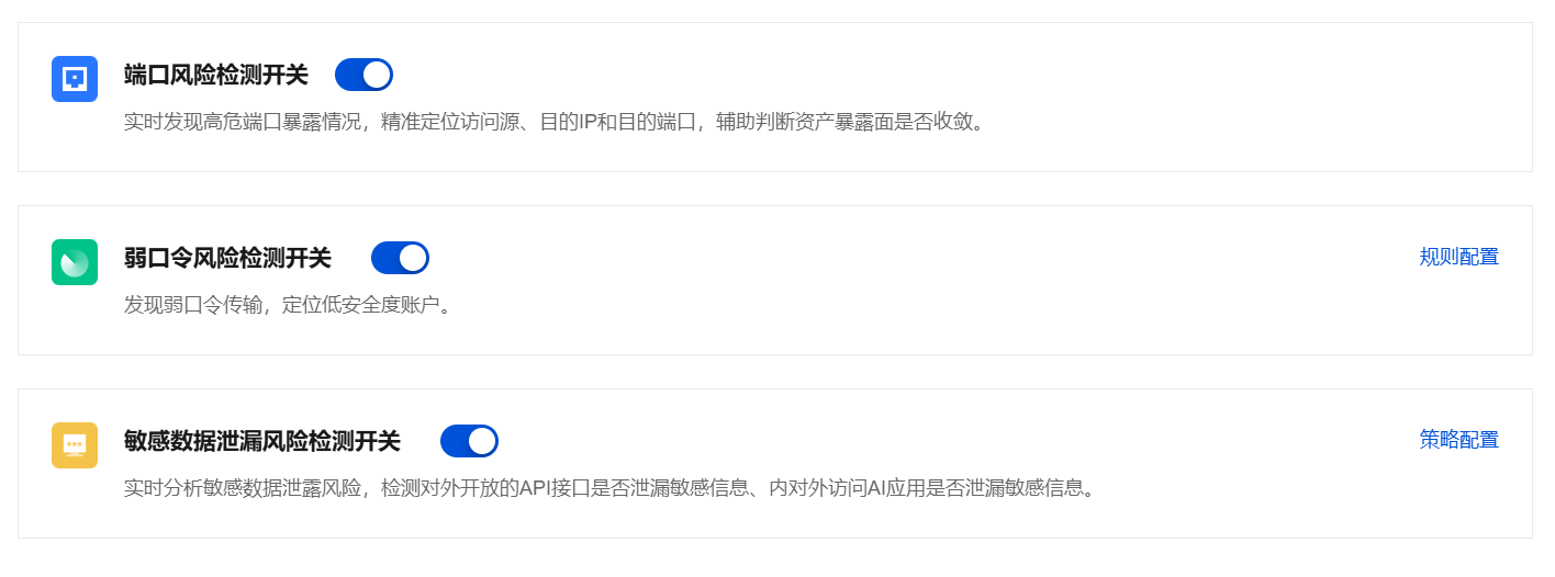 2. 您可在此对端口风险、弱口令风险、敏感数据泄漏风险进行开关操作: