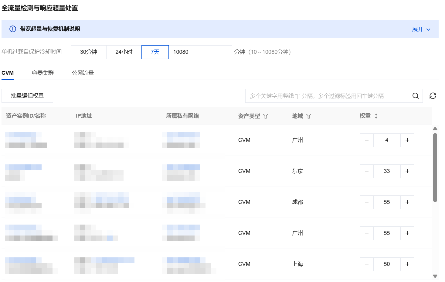 恢复机制:实时带宽 ≤ 购买规格时,系统优先自动开启高权重解析(权重相同则按峰值带宽降序开启),自动开启全流量检测与响应开关。