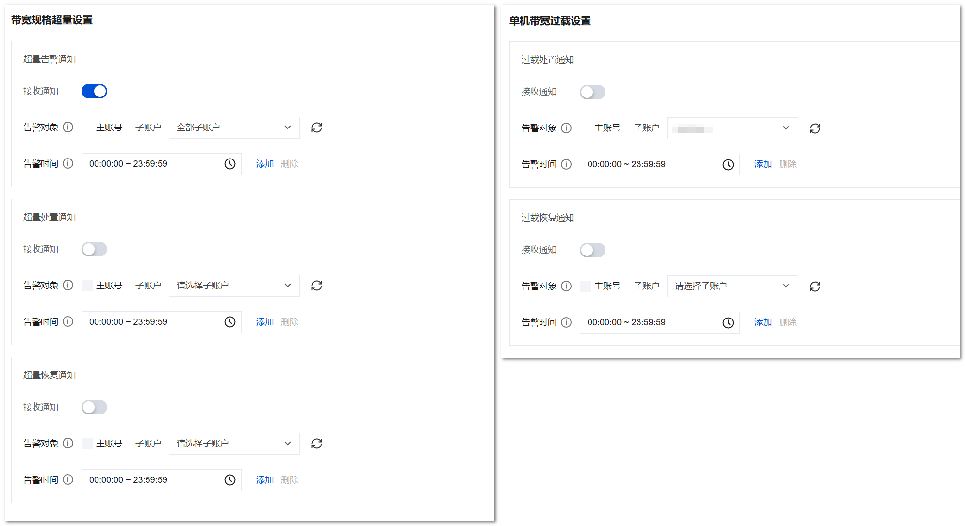告警对象:从子账户列表中勾选需通知的子账户,并可同时勾选主账号一并通知。