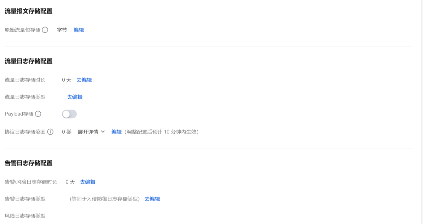 | Payload 存储 | 开启时:HTTP 解析数据全保存; 关闭时:只保留 HTTP 协议请求和响应头部,不保留 HTTP Payload 详情和 TCP 请求和响应包。 |