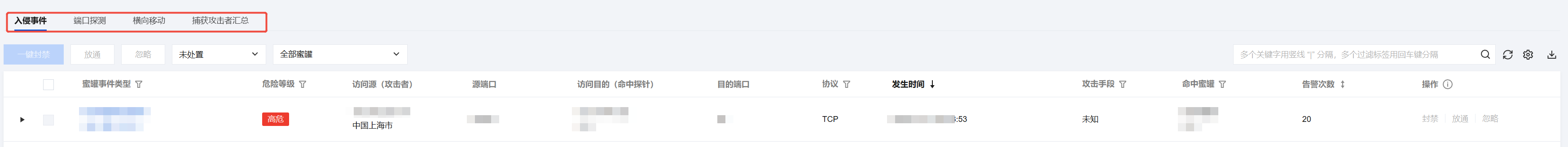 在攻击欺骗事件页面,支持对单条欺骗事件信息进行处置。在事件右侧栏处,进行封禁、放通、忽略、隔离操作。 说明
