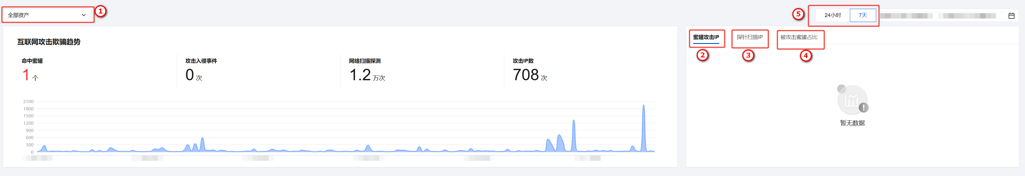 攻击欺骗事件页面可以根据可视化统计和列表式统计,对所有已设置的暴露探针和 网络蜜罐 的扫描和攻击行为进行记录和整合,从而对所有已拦截事件进行统计分析和处置,统计数据每20分钟更新一次。 1. 登录 云防火墙控制台,在左侧导航中,单击告警中心 > 攻击欺骗事件。 2. 在攻击欺骗事件页面,支持根据①探针资产、②蜜罐攻击 IP、③探针扫描 IP、④被攻击蜜罐占比和⑤时间统计并进行可视化分析,在页面左侧查看不同探针或全部探针在不同时间段的命中蜜罐数,攻击入侵事件数,网络扫描探测次数和攻击 IP 的次数。