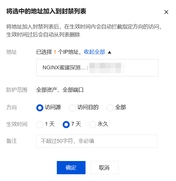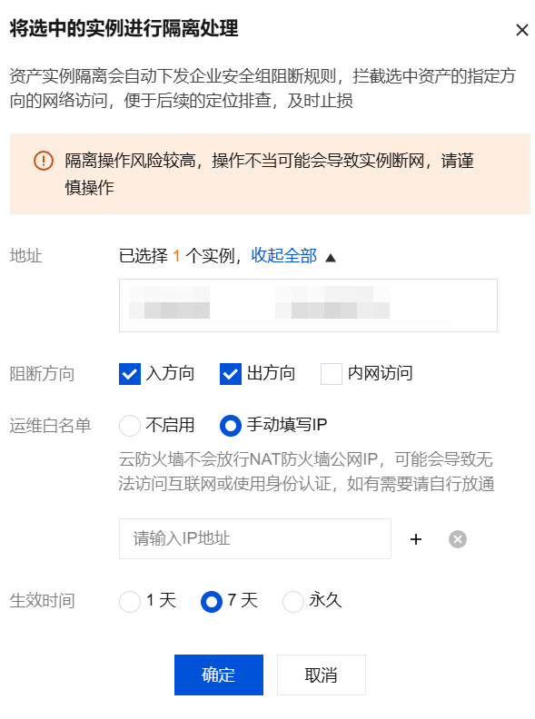 隔离:单击隔离,资产实例隔离会自动下发企业安全组阻断规则,拦截选中资产的指定方向的网络访问。主要用于资产间横向移动的攻击欺骗事件,便于后续的定位排查,及时止损。