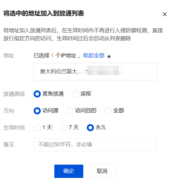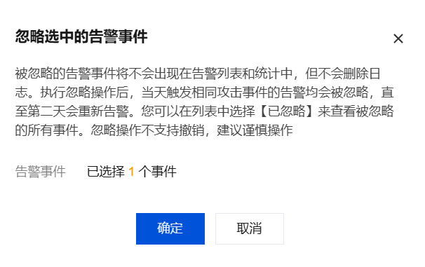 用户需要修改操作,可在入侵防御 > 拦截列表、放通列表或者隔离列表中恢复操作。忽略操作不支持撤销,建议谨慎操作。