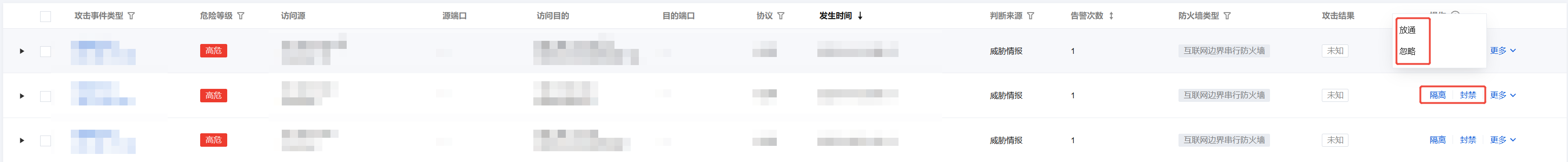 在 攻击告警汇总页面,支持对单条告警信息进行处置。在事件操作栏,对访问源进行封禁、放通、忽略、隔离操作。 说明: