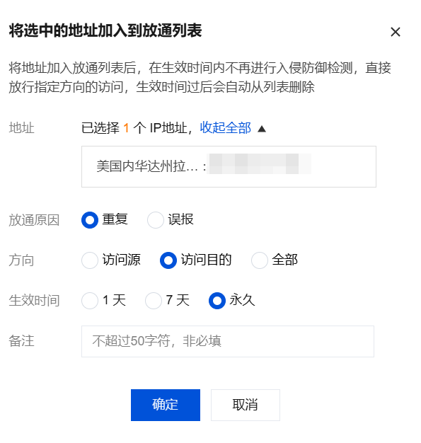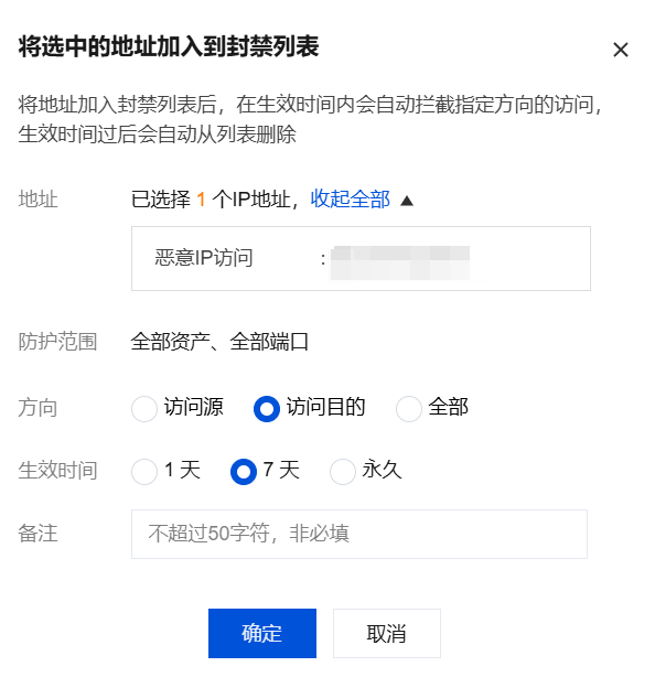 封禁:针对危险等级较高或告警次数较多的安全事件,可以单击封禁,将该 IP 地址添加至 入侵防御 模块的封禁列表(黑名单),并选择封禁时间,添加备注,云防火墙会在时间范围内,自动拦截该 IP 地址对用户全部资产的访问。 注意: