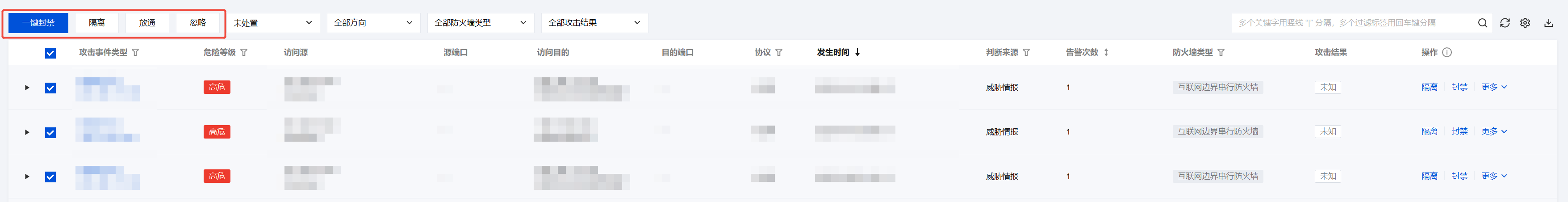 在 攻击告警汇总页面 ,支持对多条告警信息进行处置。可以选中多条告警信息,单击一键拦截、放通、隔离或忽略。 注意: