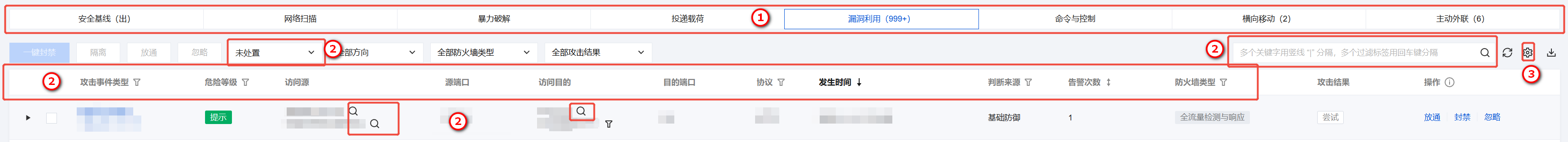 在 攻击告警汇总页面 的事件列表中,可以根据①告警事件类型、②条件筛选、③自定义表头对已有的攻击告警事件进行定位。 告警事件类型:单击图中①处按钮,查看不同分类下的告警信息详情。