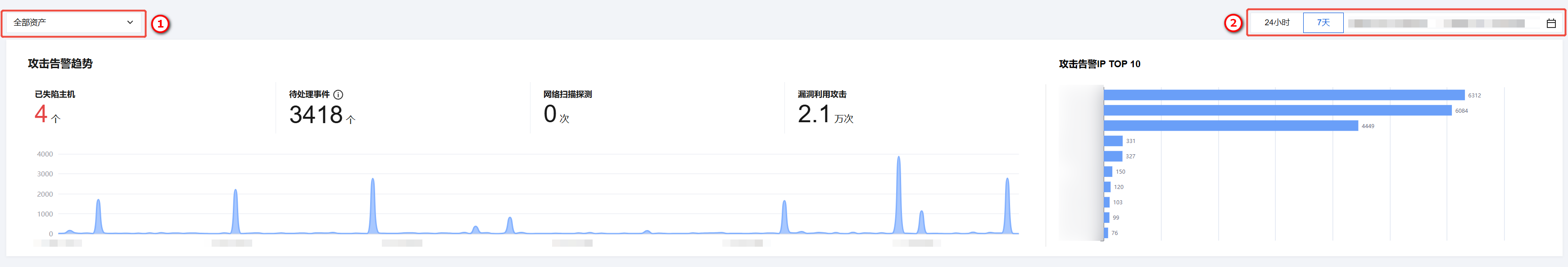 1. 登录 云防火墙控制台,在左侧导航中,单击告警中心 > 攻击告警汇总。 2. 在攻击告警汇总页面,根据①个人资产、②时间对已有的安全告警事件进行可视化分析。