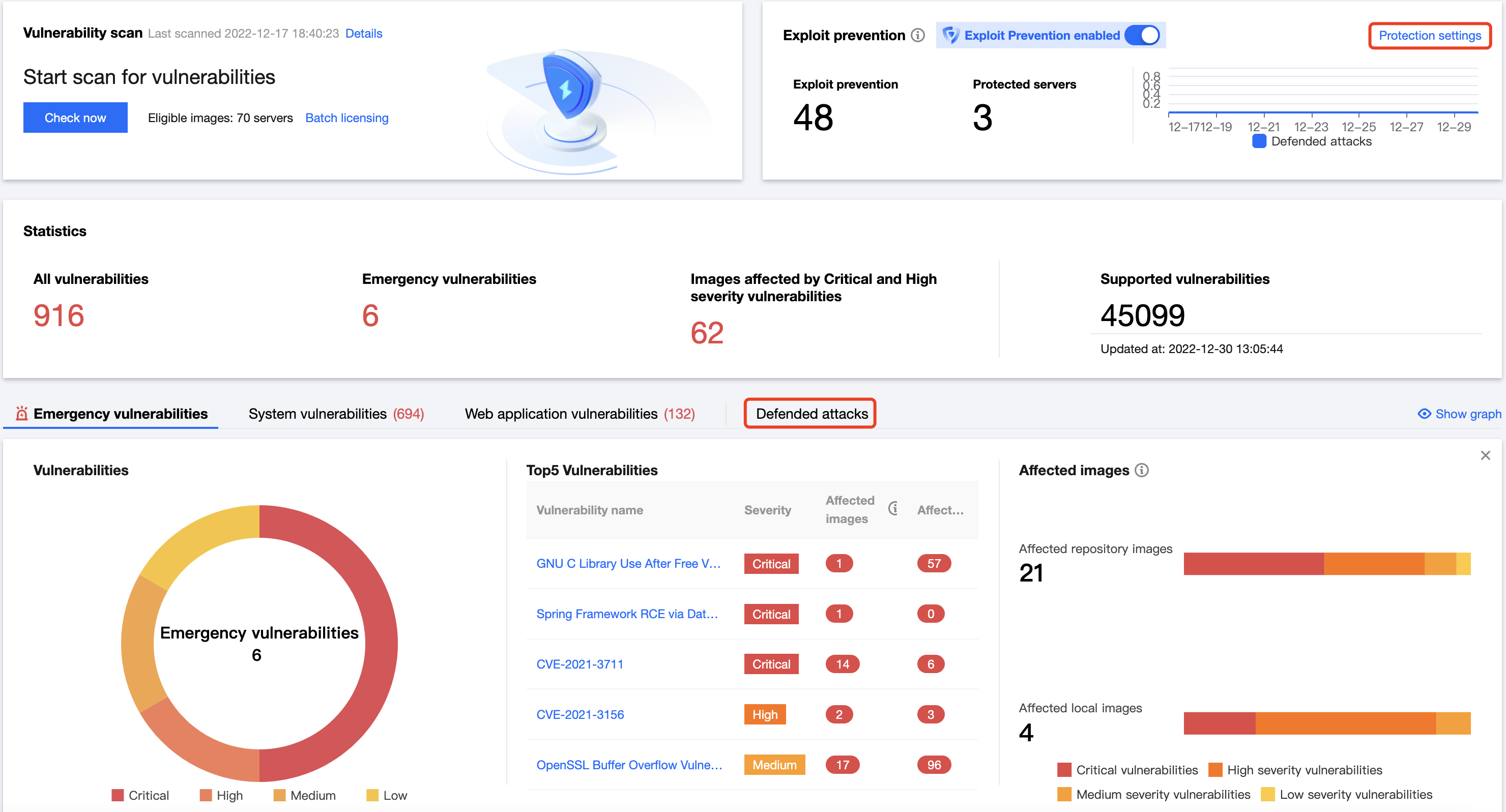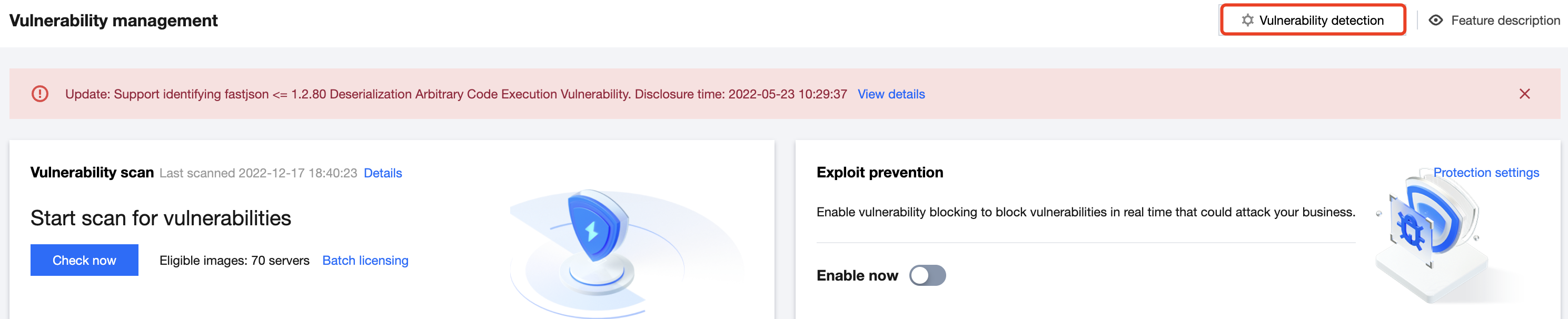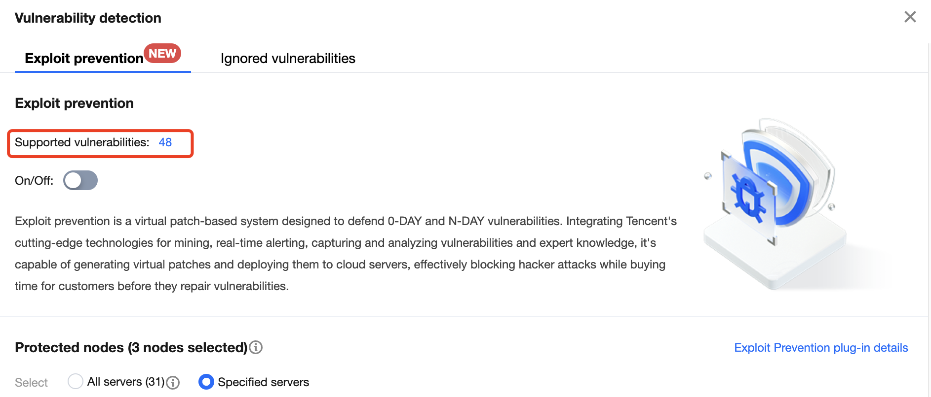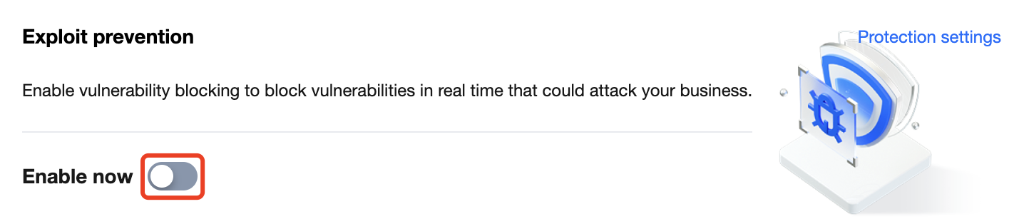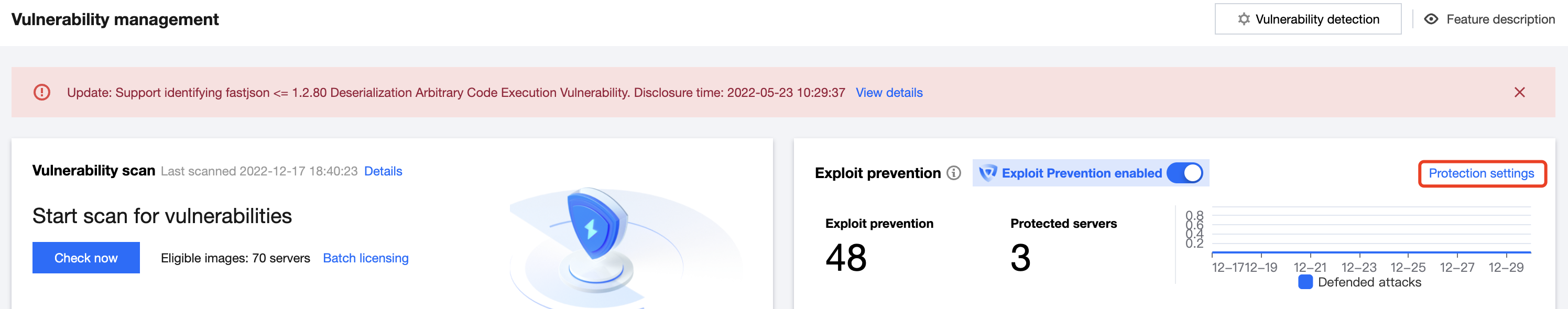 开启漏洞防御功能,实时拦截漏洞利用行为,避免业务被攻击利用。