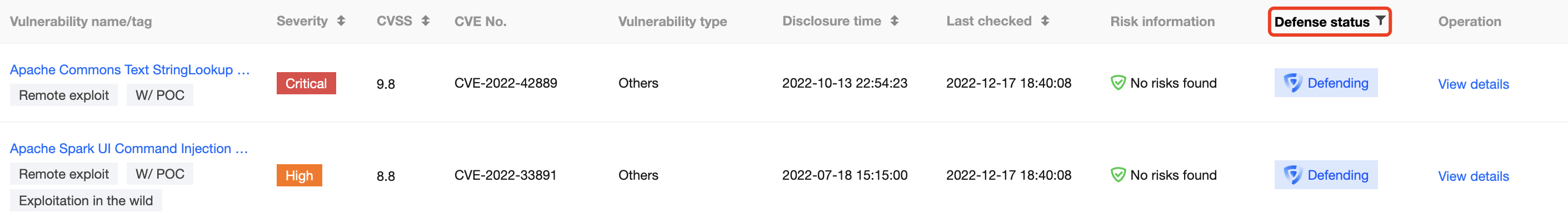 1. 开启漏洞防御后,可在应急漏洞、系统漏洞和应用漏洞页面,筛选防御状态为“防御中”的漏洞,查看支持防御的漏洞详情。