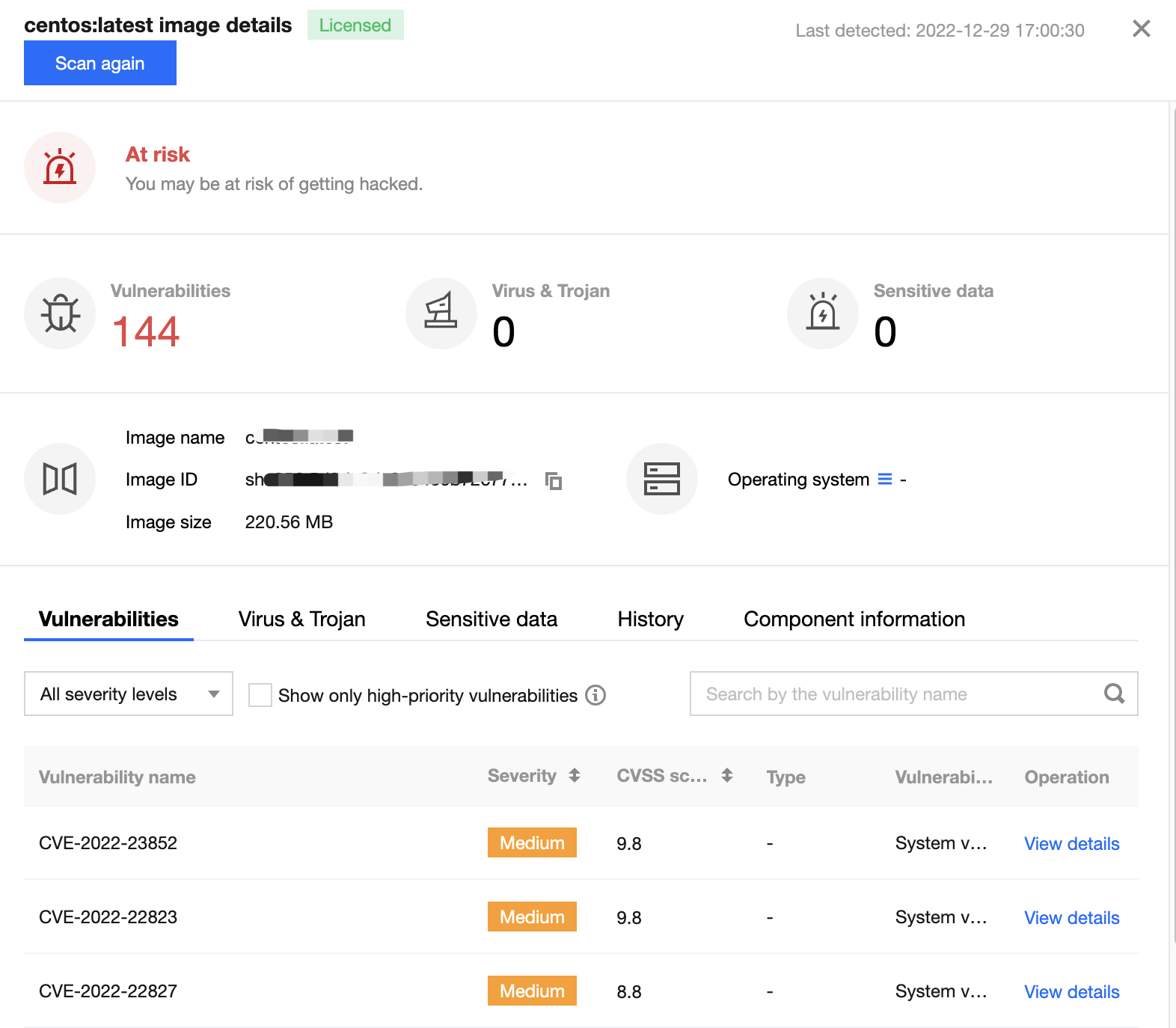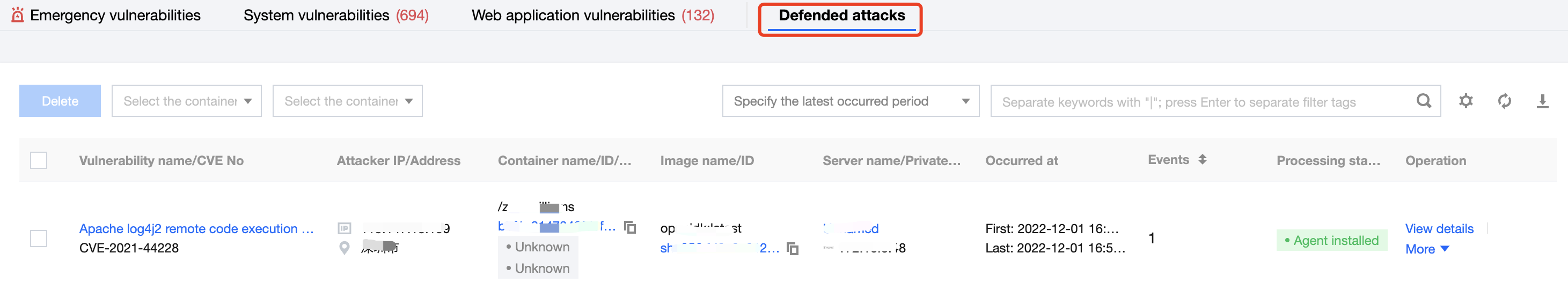 2. 单击查看详情,可在详情中查看攻击 IP、攻击包和防御插件信息,并单击镜像详情查看漏洞详细信息,建议对攻击 IP 进行封禁,对业务镜像上的漏洞进行修复。