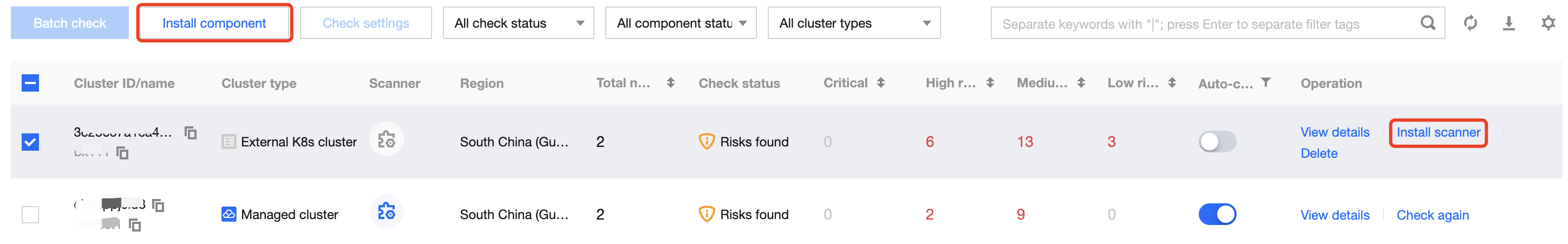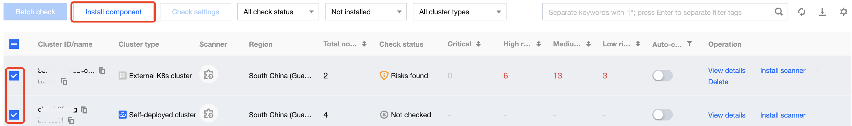 3. 在集群检查页面,支持为单个集群或多个集群安装组件。
