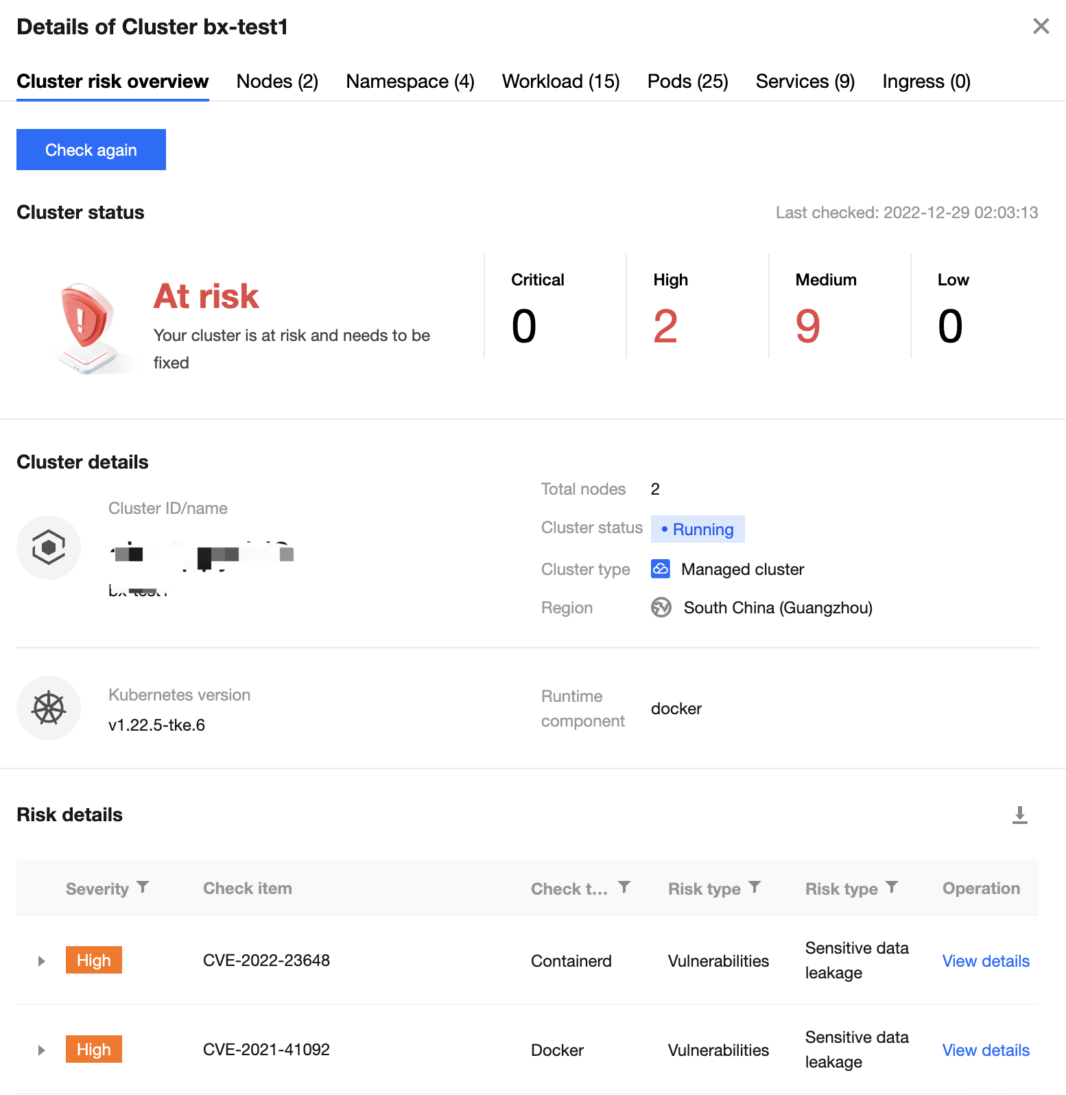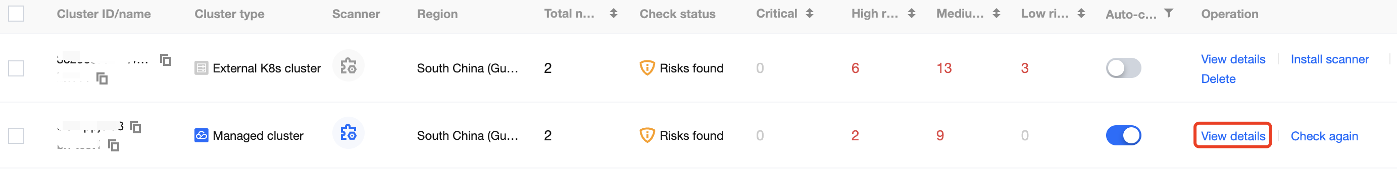 3. 在集群检查页面,单击集群列表操作列的查看详情,进入“集群风险详情”页面。