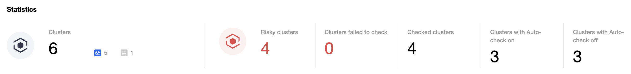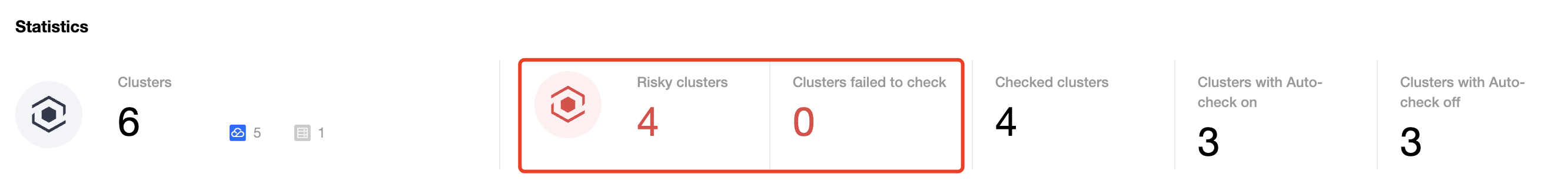 1. 在 集群检查页面,集群统计卡片展示集群总数、无风险集群数量以及未检查集群数量。