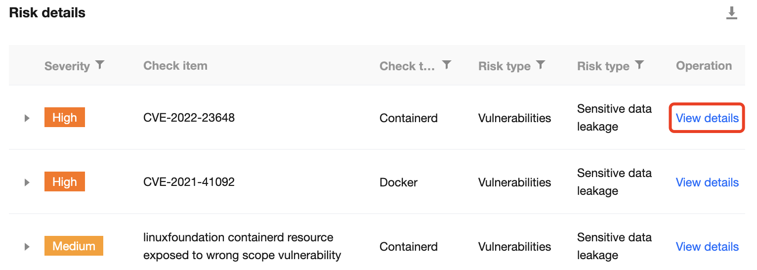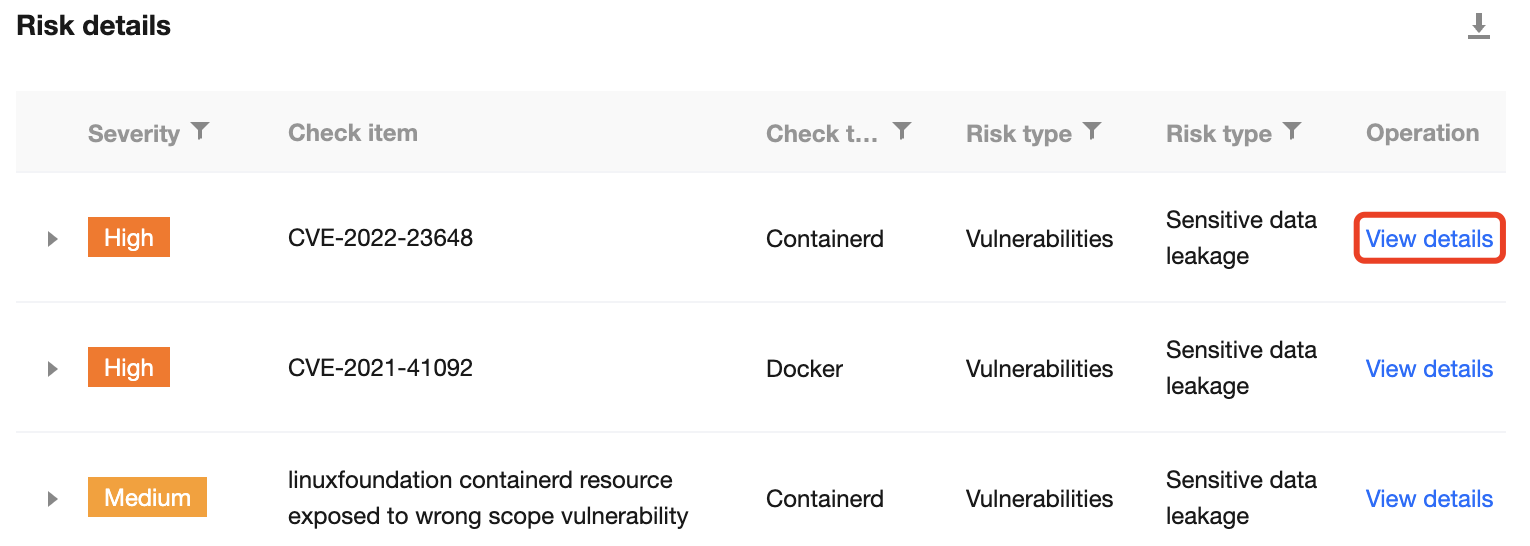 5. 在风险详情列表,选择所需风险检查项,单击查看详情,进入“风险检查项详情”页面。