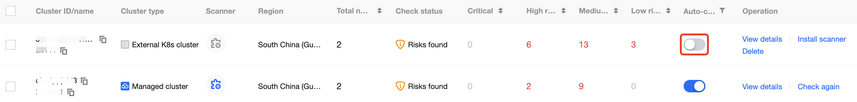 在 集群检查页面,选择多个集群,单击批量检测,即可批量开启集群自动检查。 说明: