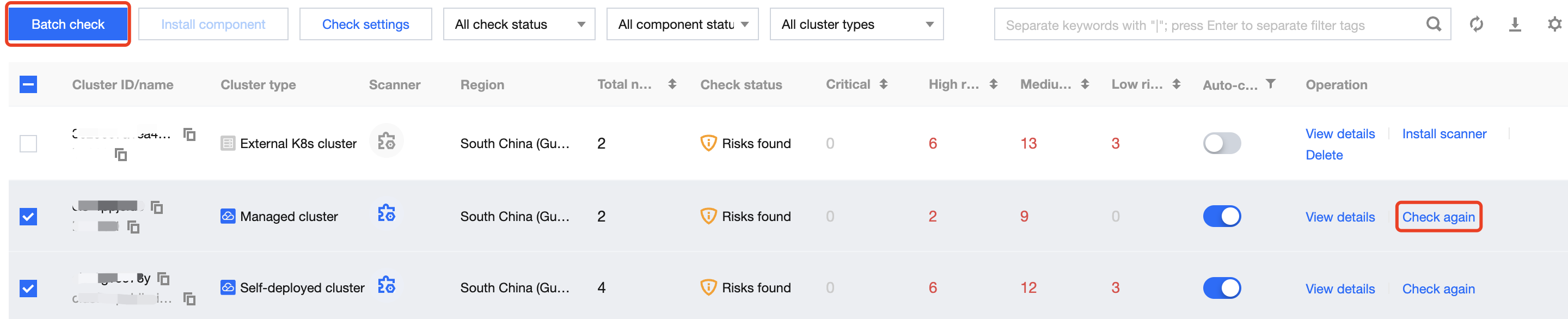 在 集群检查页面,检查组件安装成功后系统会自动执行一次集群检查,您也可指定集群单击重新检查或指定多个集群单击批量检查执行集群检查。 说明: