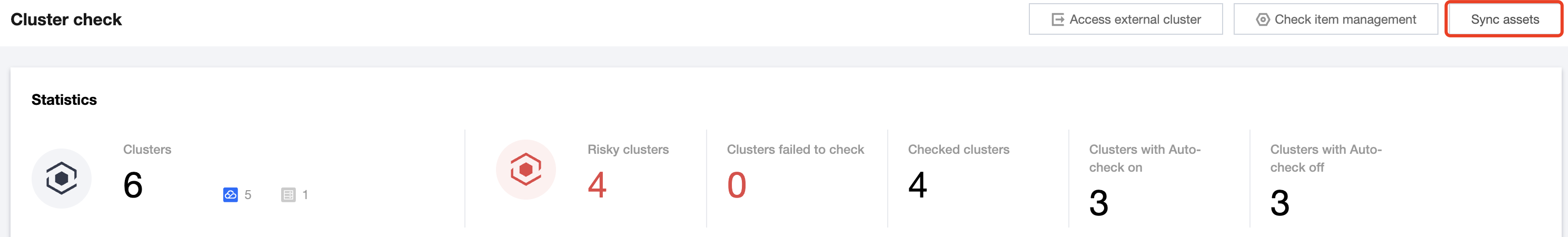 2. 在集群检查页面,已内置每1小时定期同步集群资产;单击同步资产,可进行手动同步集群资产。