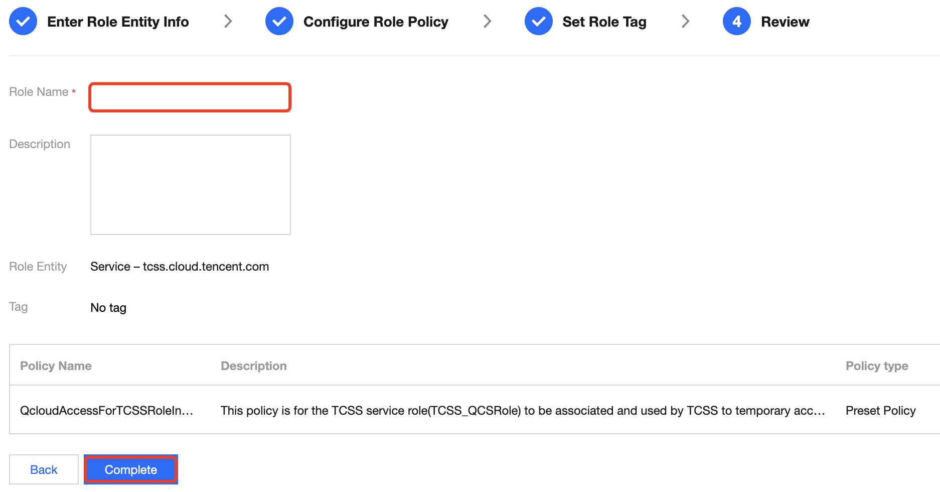 6. 在审阅中,角色名称务必配置为 TCSS_QCSRole,容器安全服务严格按该角色名称拉取配置权限;角色描述可用户自定义或为空。配置完成,单击完成,验证身份信息后即可在角色页面查看该角色和关联的策略。