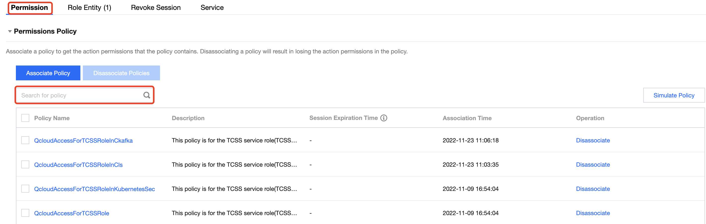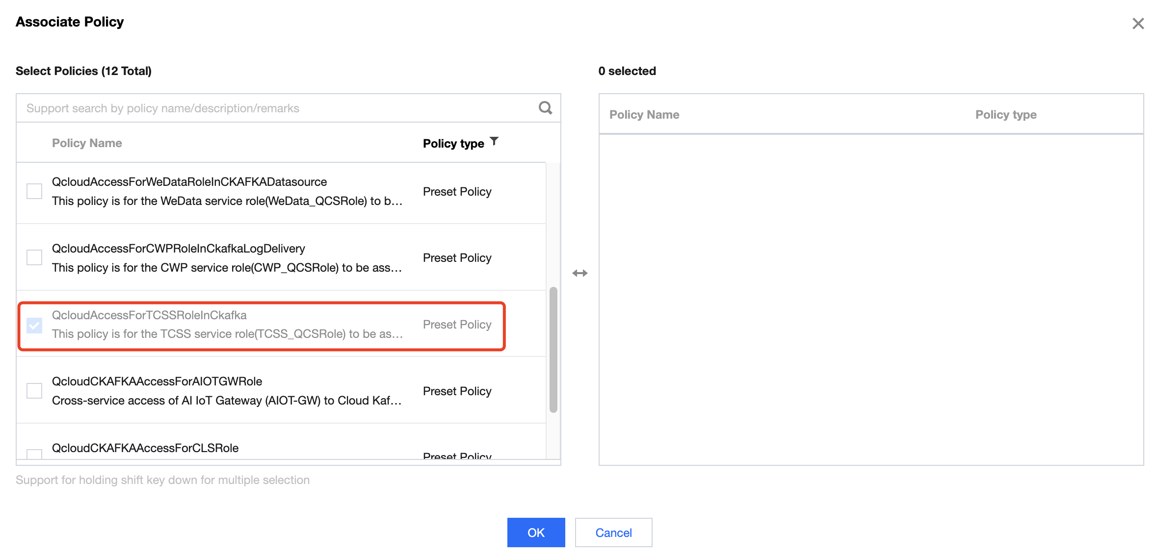 2.2 在关联策略弹窗中,分别检索策略名 QcloudCamSubaccountsAuthorizeRoleFullAccess 和 QcloudAccessForTCSSRoleInCkafka,勾选策略并单击确定,即可在 TCSS_QCSRole 角色详情中查看到该条策略。
