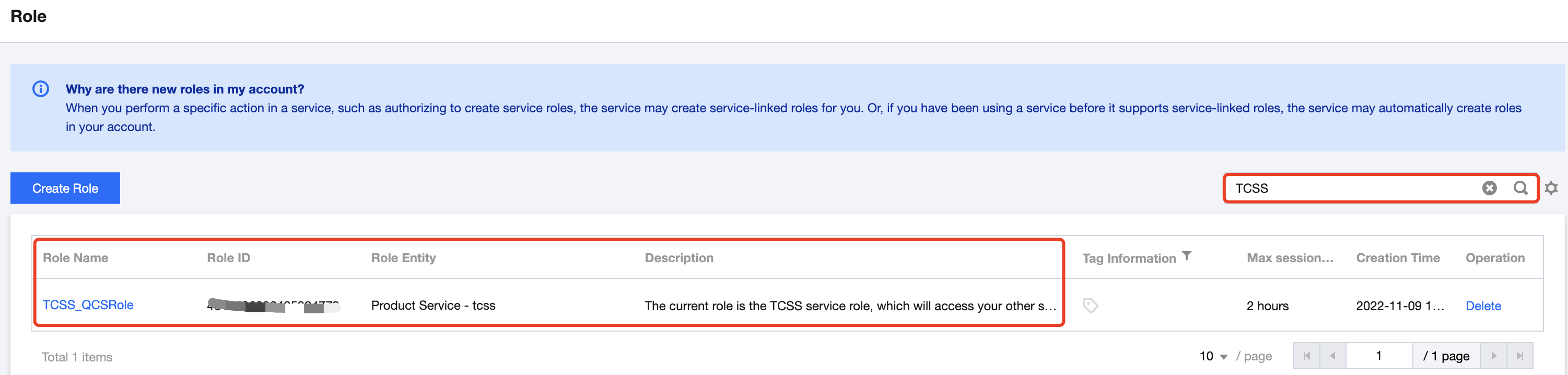 1. 在 角色页面 的搜索框中,输入 TCSS,如检索不到下图中角色名称为:TCSS_QCSRole、角色载体为:产品服务 - tcss 的内容,则说明该账号未绑定过容器安全服务产品的任何策略角色,需在列表中新建角色。