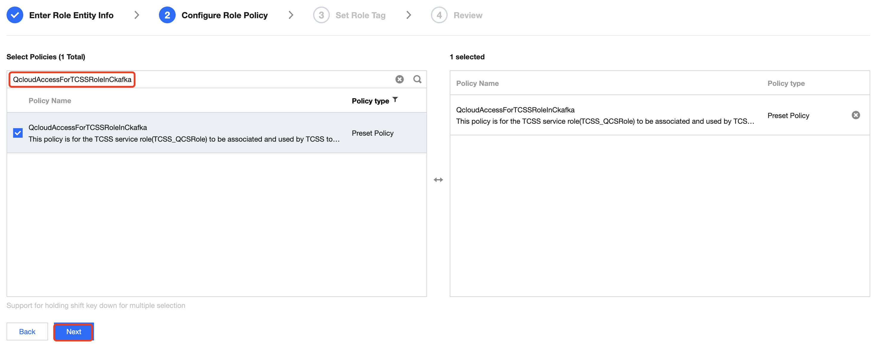 4. 在配置角色策略中,分别检索并勾选策略名 QcloudCamSubaccountsAuthorizeRoleFullAccess 和 QcloudAccessForTCSSRoleInCkafka,单击下一步。