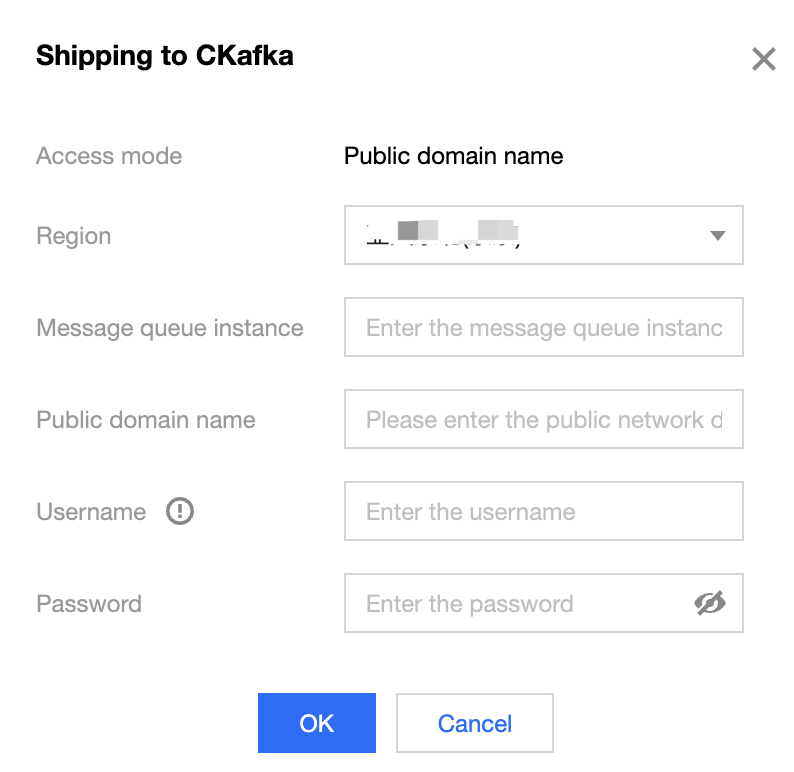 3. 在 CKafka 投递配置页面,需授权接入,并配置消息队列实例、公网域名接入、用户名和密码,单击确定。