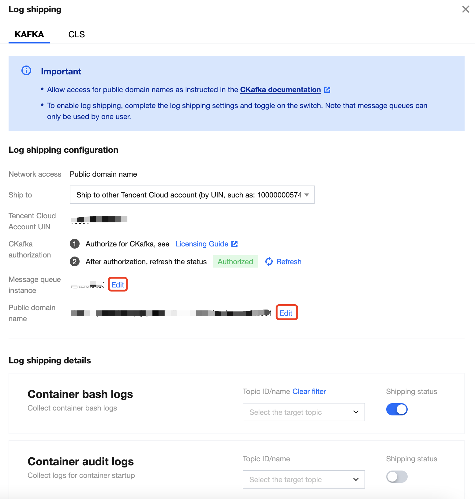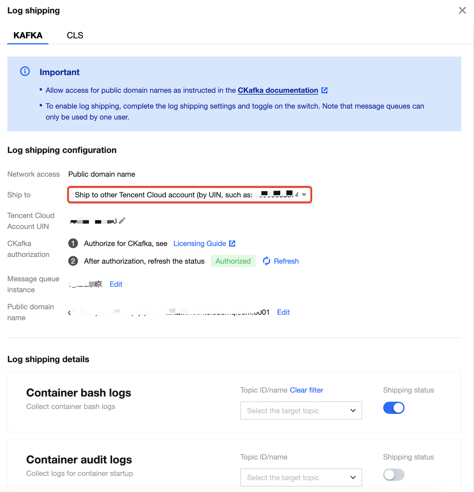 接收账号在腾讯云 Ckafka 控制台 配置消息实例时,需选择公网域名方式,并创建3个可接收容器安全服务审计日志的 topic。 将该消息实例的 ID、公网域名,以及接收3类日志所需的 topic ID 和名称记录备份,牢记用户名和密码信息。跨账号授权完成后需在投递账号填写上述信息。