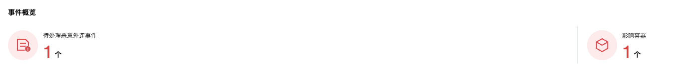 1. 登录 容器安全服务控制台,在左侧导航中,单击运行时安全 > 恶意外连,默认进入事件列表页面。 2. 在事件列表页面的事件概览中,将根据系统上报的安全事件,实时统计待处理的恶意外连事件及其影响的容器数量。