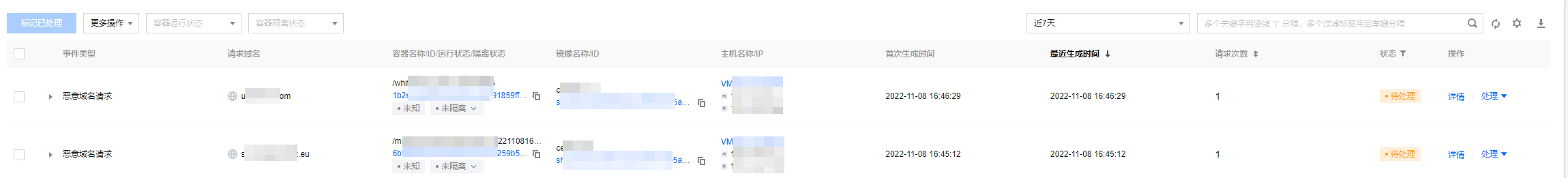 | 系统按容器 ID、域名、进程路径、进程启动用户等对待处理安全事件进行聚合展示,聚合周期为当天。 |