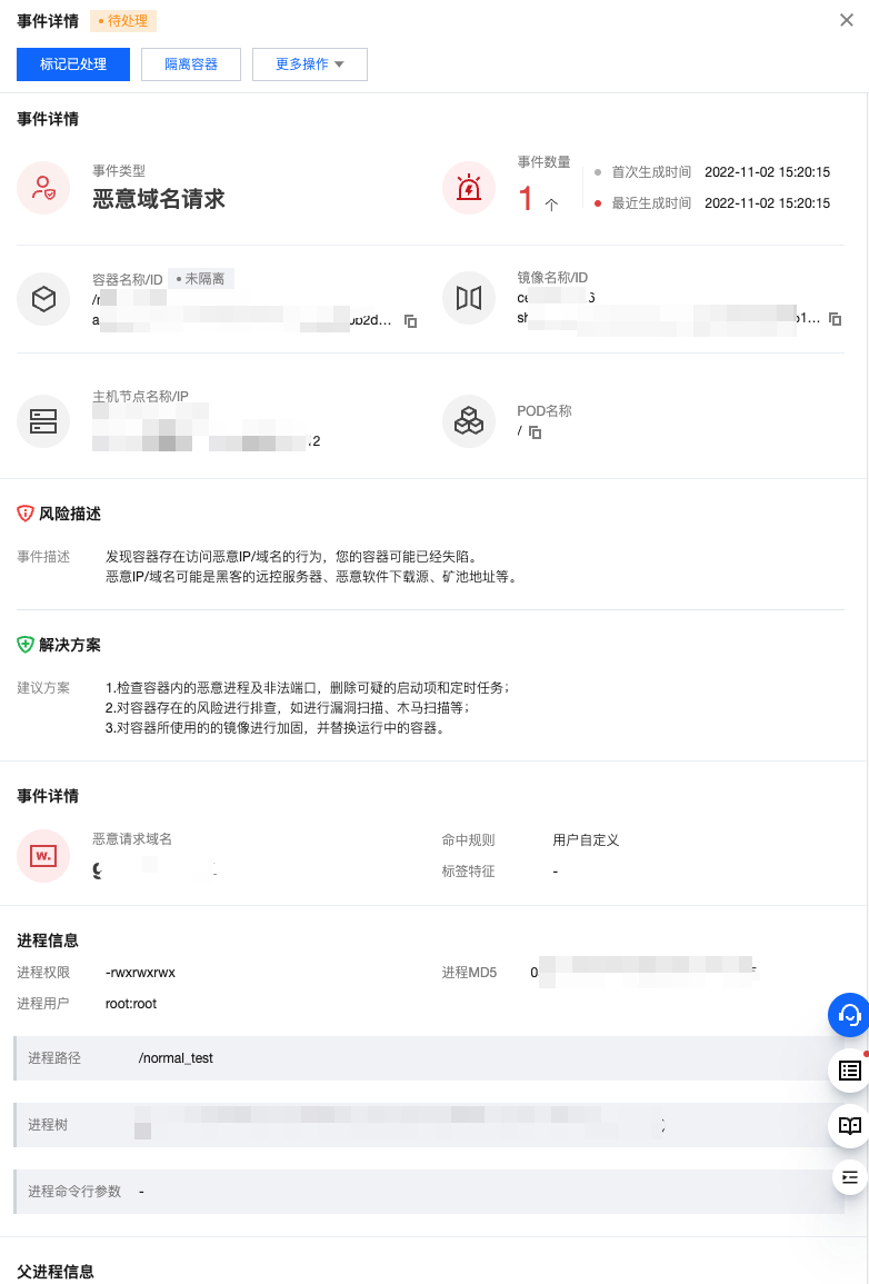 | 单击详情查看事件详情。详情包括事件详情,关联容器、镜像、主机等资产信息,风险描述,解决方案,请求域名详情和三层进程信息。 单击处理对安全事件进行处理。包括添加白名单、标记已处理、隔离容器、忽略和删除记录。 |
