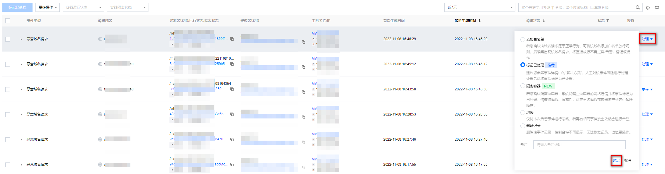 1. 在事件列表中,单击处理,可以选择对事件进行添加白名单、标记已处理、隔离容器、忽略和删除记录,单击确定。