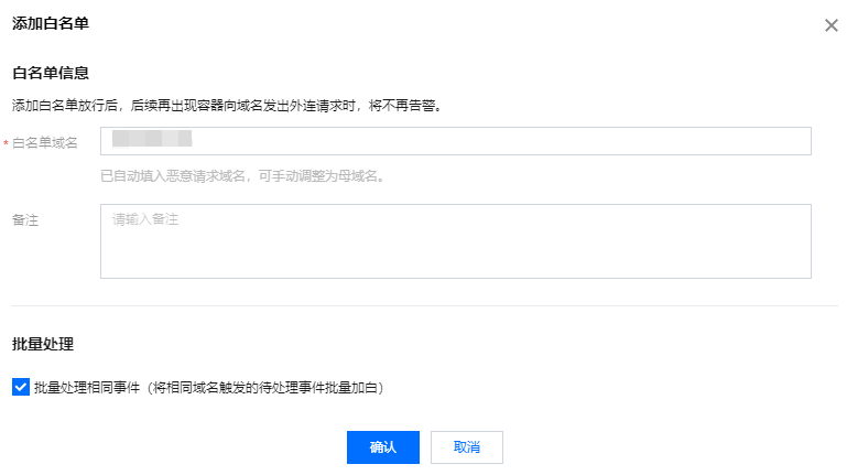 添加白名单:输入白名单域名和备注,单击确认。添加白名单时,系统会根据加白的来源事件自动填入请求的域名,如有需要可手动调整为母域名。同时可勾选“批量处理相同事件(将相同域名触发的待处理事件批量加白)”,勾选并确认后,系统将批量对相同域名产生的安全事件批量加白处理。