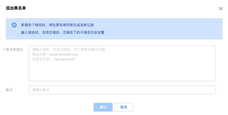 1. 登录 容器安全服务控制台,在左侧导航中,单击运行时安全 > 恶意外联 > 黑白名单管理。 3. 在添加黑名单窗口中,可支持批量新增多个自定义黑域名;输入域名时,支持前缀置空的泛域名,例如*.tencent.com;泛域名下的子域名均会告警。