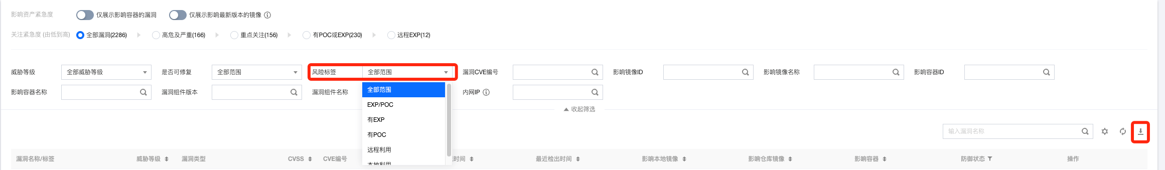 应急漏洞修复完成后,客户可优先挑选具有 EXP、POC、远程利用、在野利用等标签的系统漏洞和应用漏洞进行修复。对风险标签进行筛选,单击,选择仅导出筛选结果,在列表中查看影响本地镜像的漏洞,对存在这些标签的本地镜像进行修复。