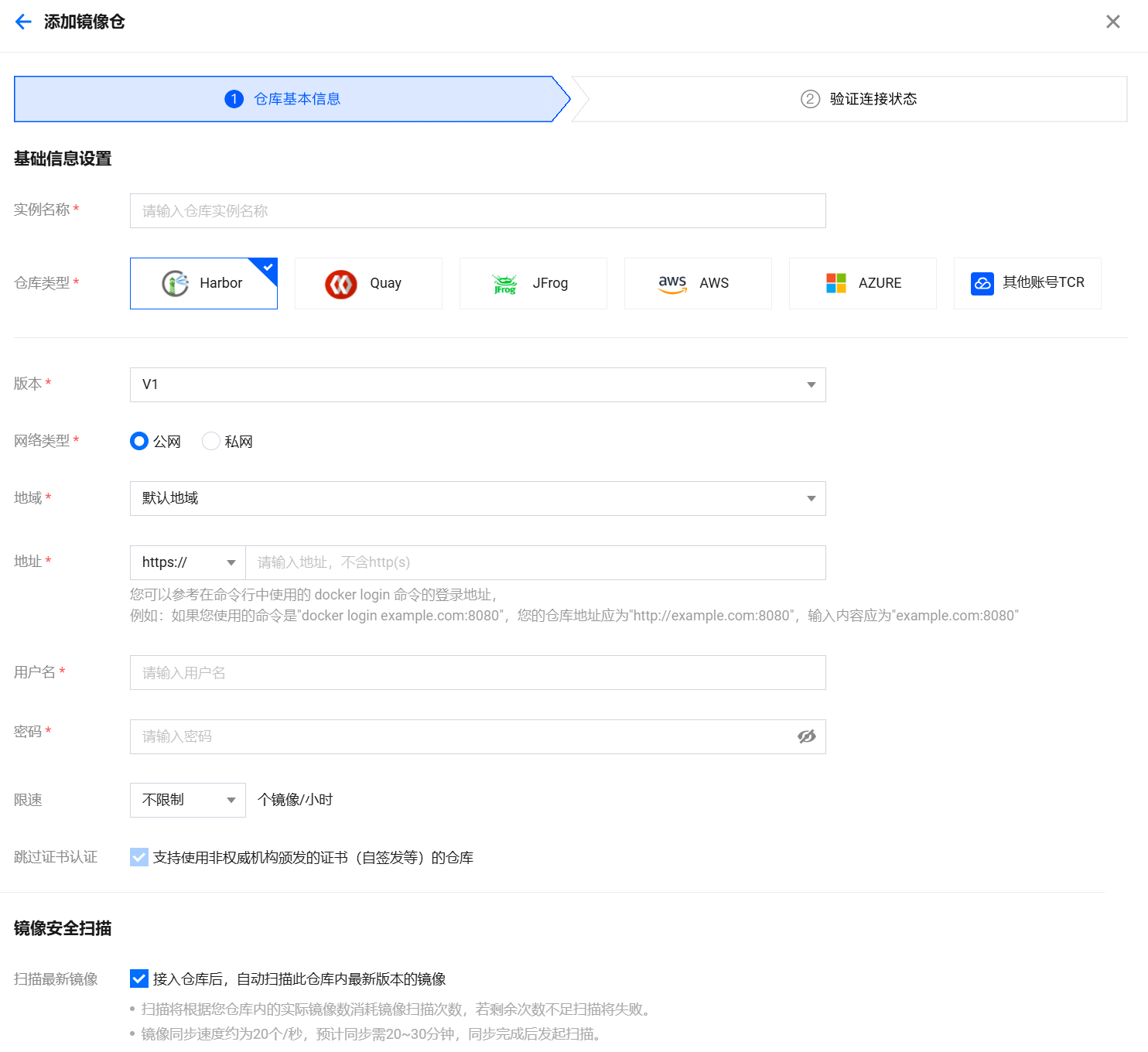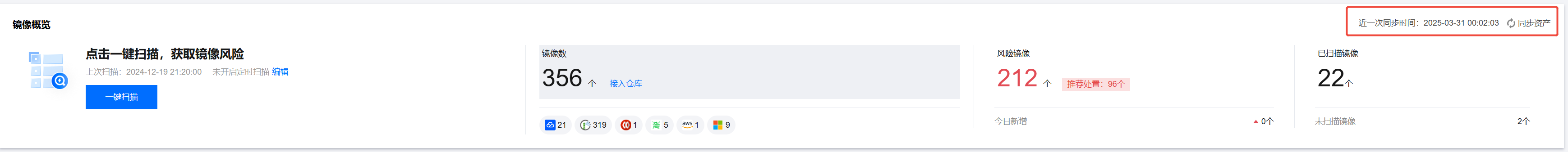 TCR 和 CCR 镜像默认自动拉取,当有新镜像入仓时,在 仓库镜像页面,单页右上角的同步资产即可更新资产。 当客户镜像存储在 Harbor 仓库时,客户需手动接入仓库再拉取镜像资产。在仓库镜像页面,单页右上角的镜像仓管理 > 添加镜像仓,按要求验证仓库基本信息、连接地址等即可。 扫描与查看仓库镜像漏洞