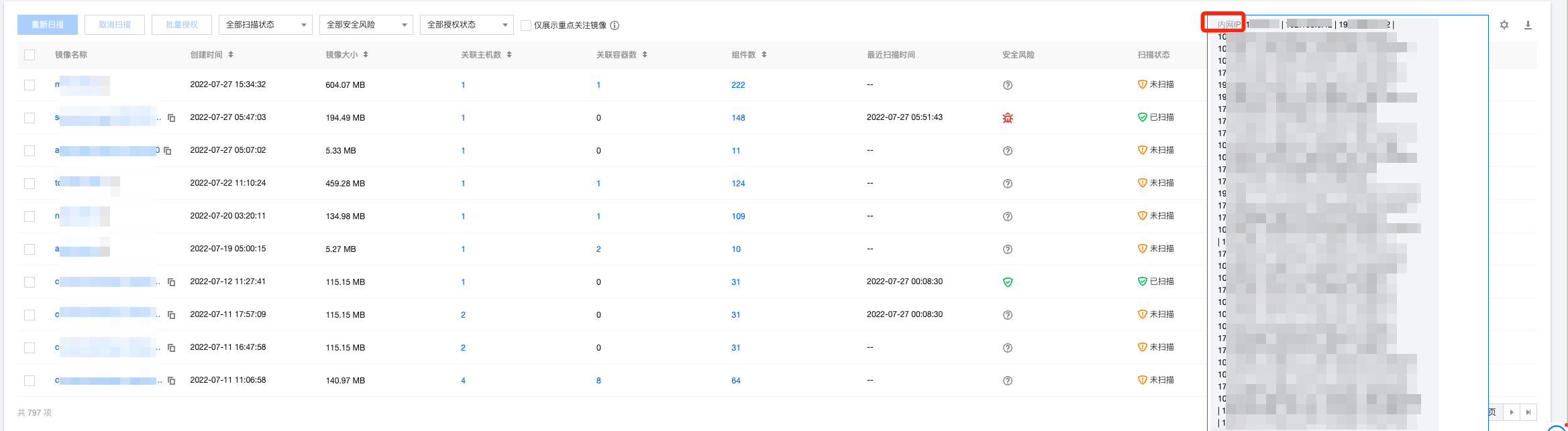 客户可在 本地镜像页面,通过内网多 IP 检索的方式,选择需要扫描漏洞风险的本地镜像。 查看本地镜像漏洞